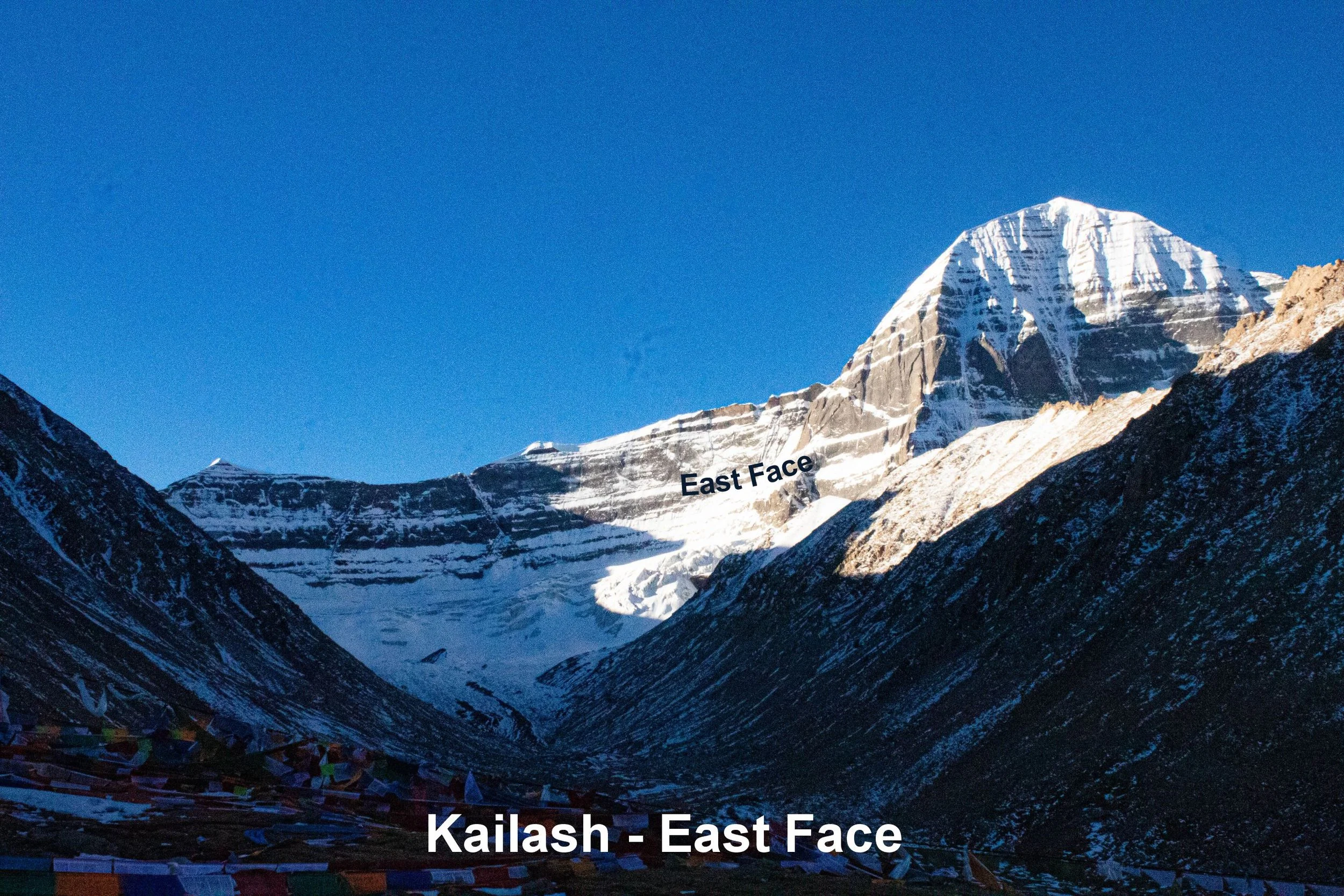 As we make our way over the Dolma La Pass we observe the East Face. It is possible only to see this face in one area of the trail, that shows where it abuts the North Face. This face exudes the energy of white crystal quartz – sphatika and represents Moksha – liberation. We have travailed over the pass and descended into the valley on the eastern side of Kailash. We travel through life after life, traversing the heights of pleasure and pain, which are represented by the difficulties of the pass and now we finally let go of the struggle, becoming the place of beingness within the heart – liberation.