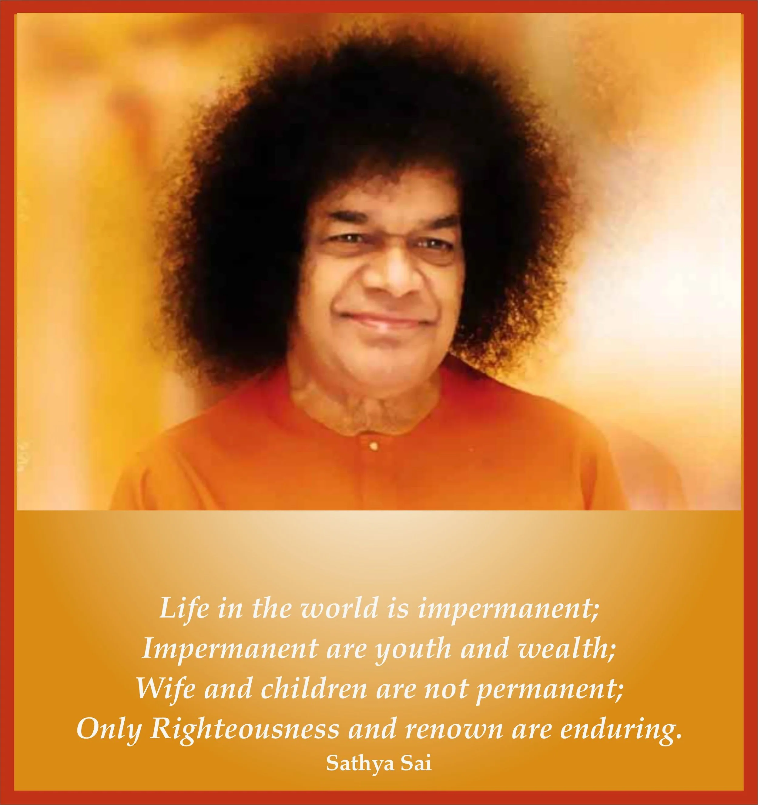 The Universe is called prapancha - a manifestation of the Pancha Bhutas - the five basic elements, ether, air, fire, water and earth. As these elements are impermanent and subject to change, all human life is related to impermanent objects and pleasures. How is one to achieve that which is lasting within the framework of the impermanent? This should be done by breaking down the separation between the permanent and the impermanent and recognising the permanent in the impermanent - the One in the many, unity in diversity. - Sathya Sai